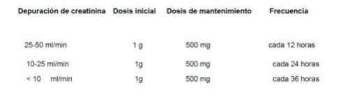 Insuficiencia renal: Se debe ajustar la dosis (oral o parenteral) con base en la tasa de depuración